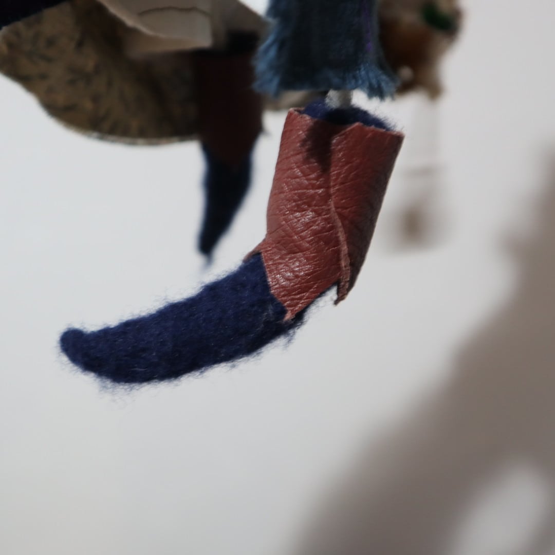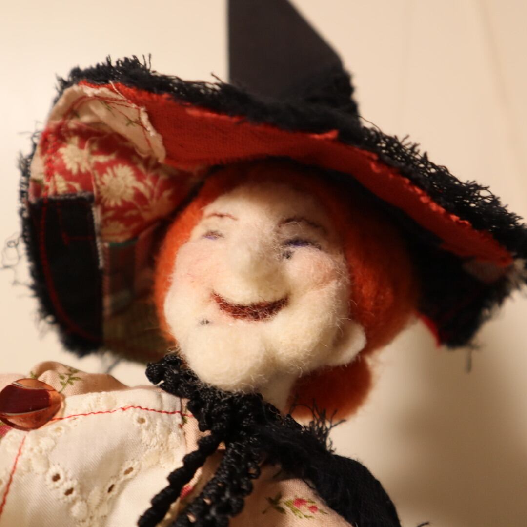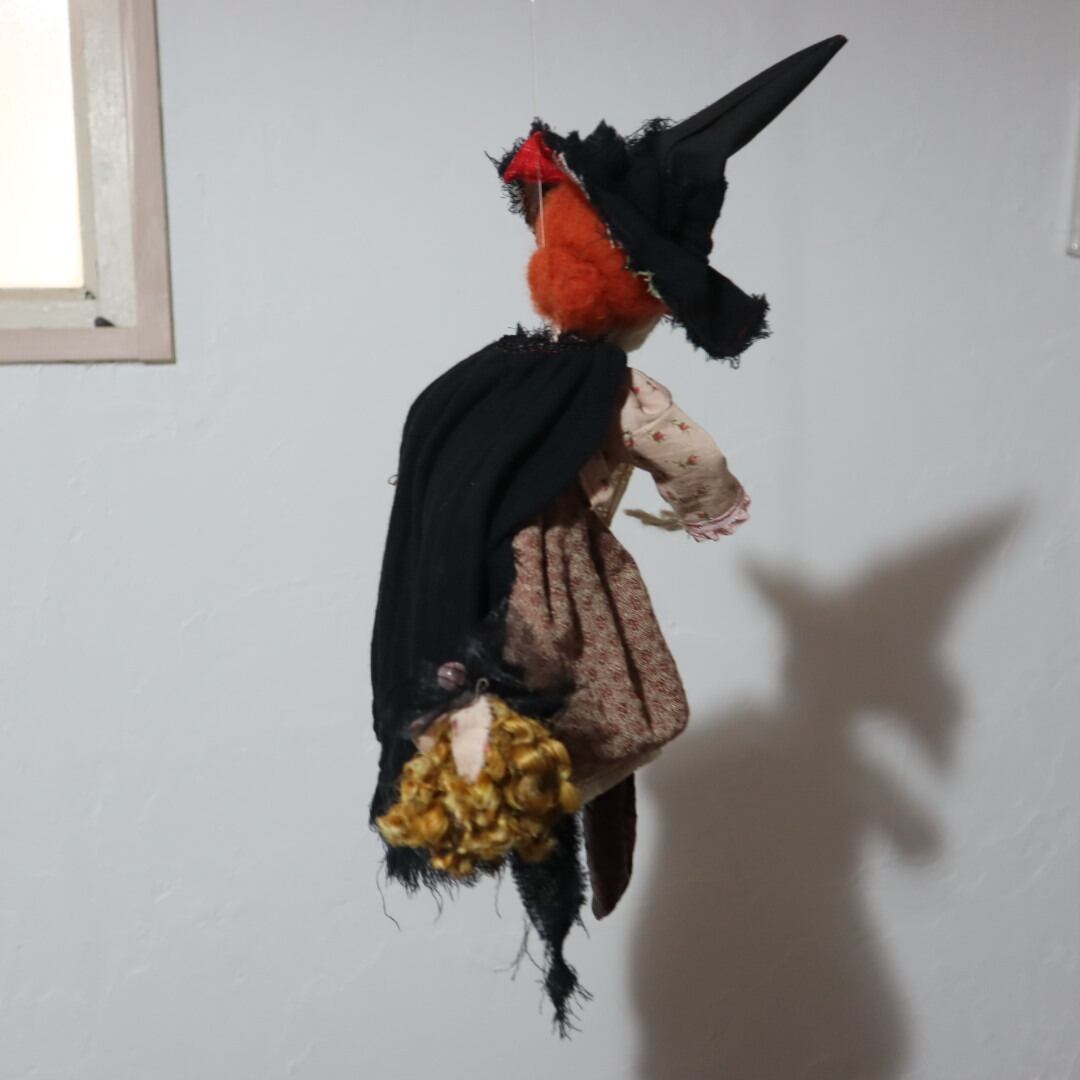 ほうきに乗って飛ぶ姿の魔女の人形です